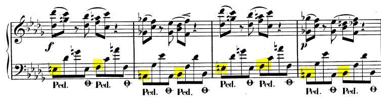 자세히 보면 왼손 옥타브 베이스가 큰 틀 안에서 순차진행하고 있다.