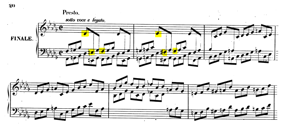 화려한 기교, 구획을 나눌 수 없는 자유형식, 무선율에 모호한 조성감을 갖춘 점이 합쳐져 4악장은 고전시대 소나타에서는 볼 수 없는 새로운 시도로 여겨진다.