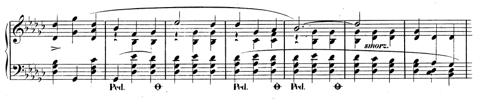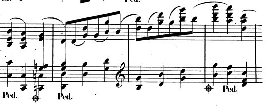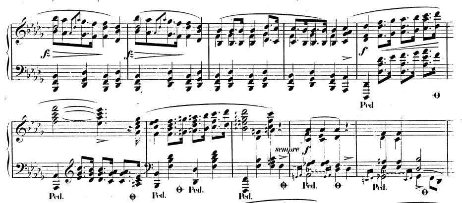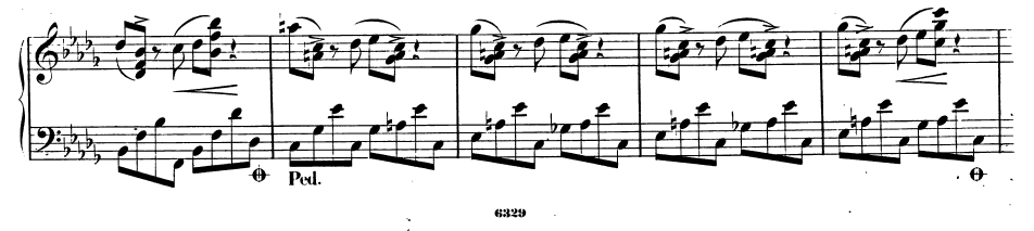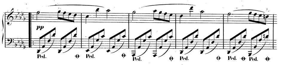 왼손은 두 화음을 번갈아가며 연주하고 있으며 오른손이 멜로디를 연주한다.