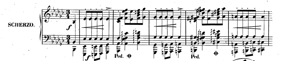 무선율임과 동시에 화성적으로도 거의 조성감을 느낄 수 없어 종지부에서야 겨우 이 악장의 조성이 b♭단조임을 알 수 있다.